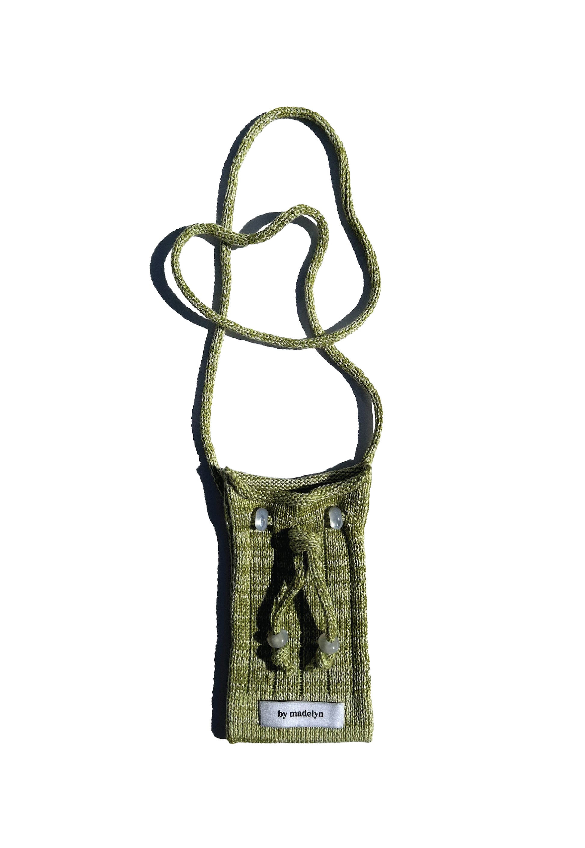 Featuring an adjustable strap, white cats eye bead details and 'by madelyn' logo on front. Made in our signature melange knit colourway, Palm.