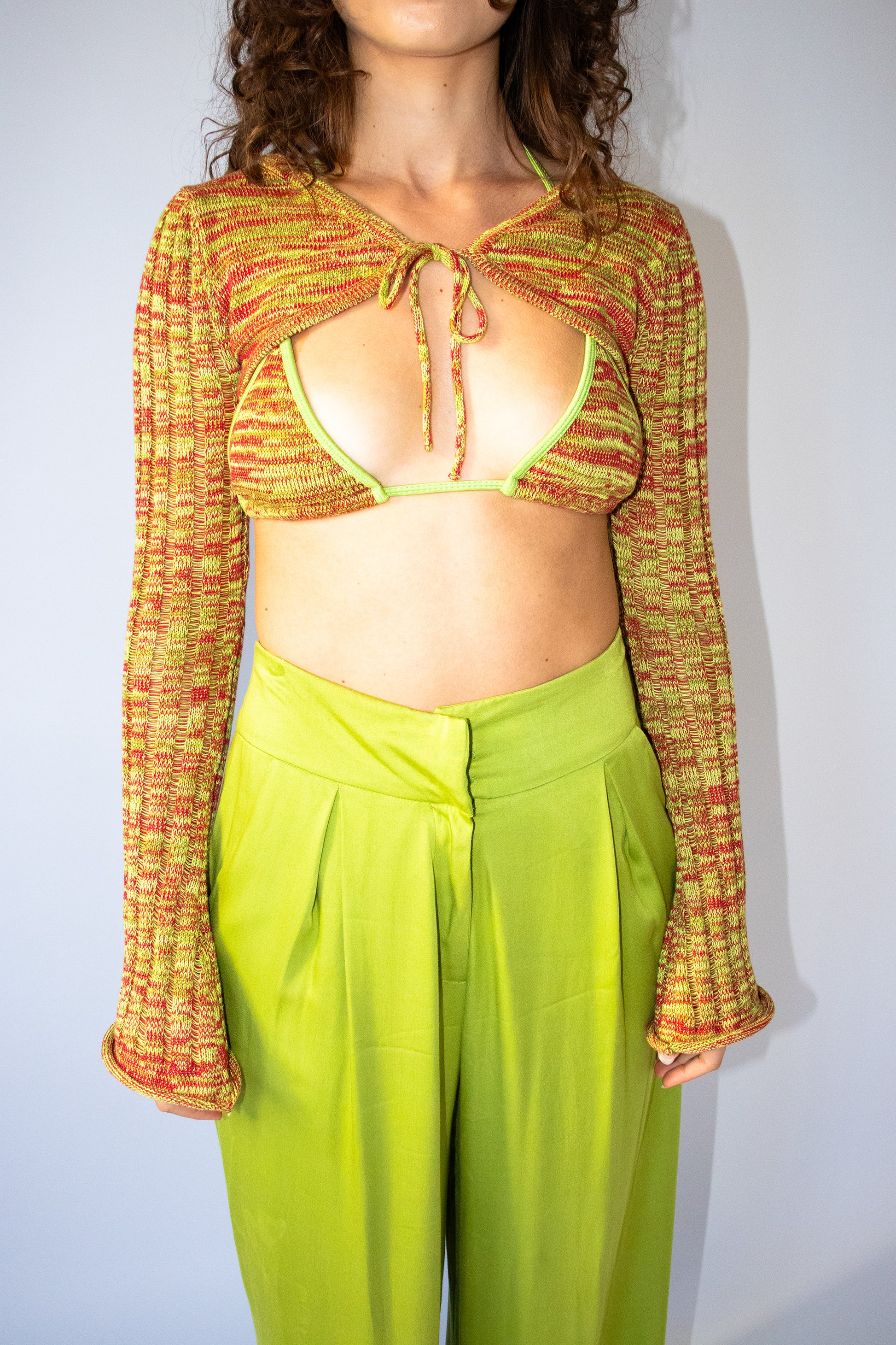 Featuring adjustable centre front ties, v-neckline, long flared sleeves and super cropped length. Made in our exclusive melange knit colourway, Pitaya.